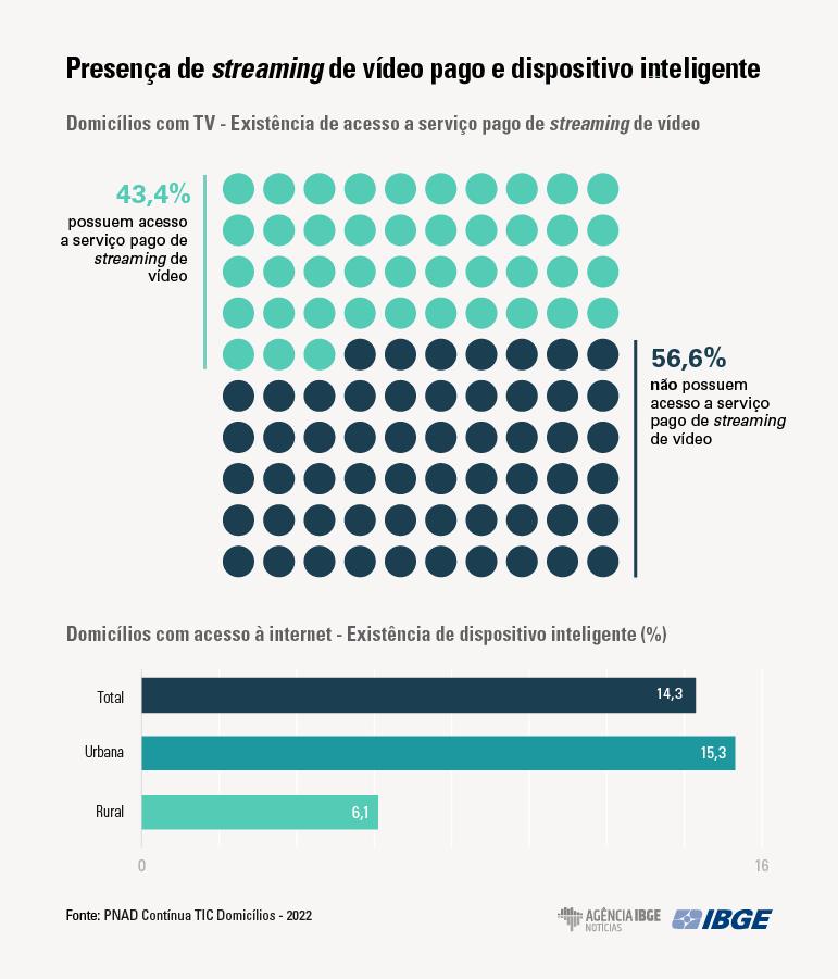 Entre os domicílios com televisão, 43,4% (ou 31,1 milhões) utilizavam algum serviço pago de streaming de vídeo. Entre os domicílios com esse serviço, 95,3% também acessavam canais de televisão, sendo 93,1% na TV aberta e 41,5% com TV por assinatura.