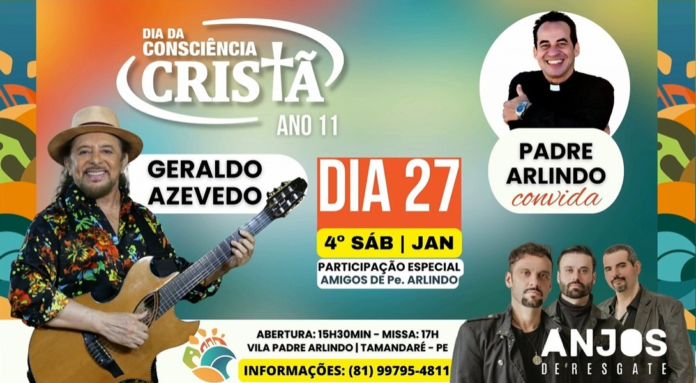 A cidade de Tamandaré já se prepara para vivenciar mais um dia de música, fé e solidariedade. Será realizado, no dia 27 de janeiro, a partir das 15h30, o 11º Dia da Consciência Cristã. O evento, concebido e promovido pelo Padre Arlindo, terá como principal atração este ano o cantor Geraldo Azevedo e também contará com a participação da banda Anjos de Resgate.