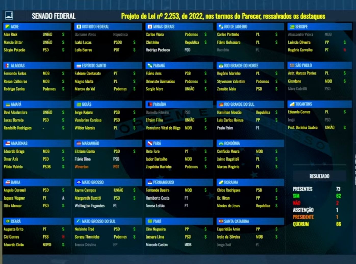 O placar foi de 62 votos favoráveis e apenas dois contrários. Houve ainda um abstenção. 16 senadores estavam ausentes ou não votaram.