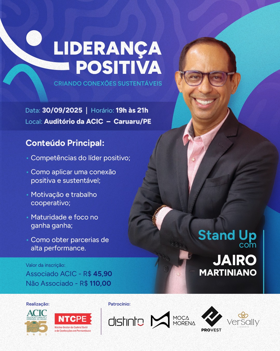 A Associação Comercial e Empresarial de Caruaru (Acic) e o Núcleo Gestor da Cadeia Têxtil e de Confecções (NTCPE) realizam, na próxima terça-feira (30), no auditório da Acic, o stand up corporativo Liderança Positiva: Criando Conexões Sustentáveis. O evento adota um formato inovador, que une palestra e show de comédia, e será conduzido por Jairo Martiniano, especialista em liderança, psicologia organizacional e gestão da qualidade. O investimento é de R$ 45,90 para associados Acic e de R$ 110 para não associados e as inscrições devem ser feitas pelo link: https://www.aciccaruaru.com/liderancapositiva.