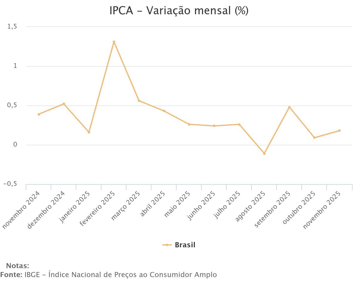 Esse resultado é o menor para um mês de novembro desde 2018, quando a variação foi de -0,21%. No ano, a inflação acumula alta de 3,92% e, nos últimos 12 meses, o índice ficou em 4,46%. Em novembro de 2024, a variação havia sido de 0,39%.